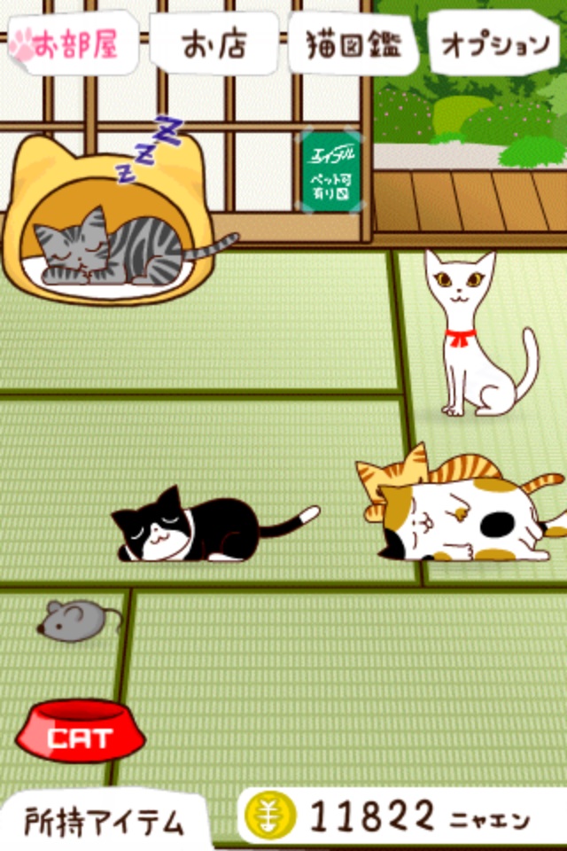 撫でて、懐いたら住民になってお家賃を収めてくれる。そのお家賃をでおもちゃやご飯を買う…という完全無料のお気楽ゲーム。