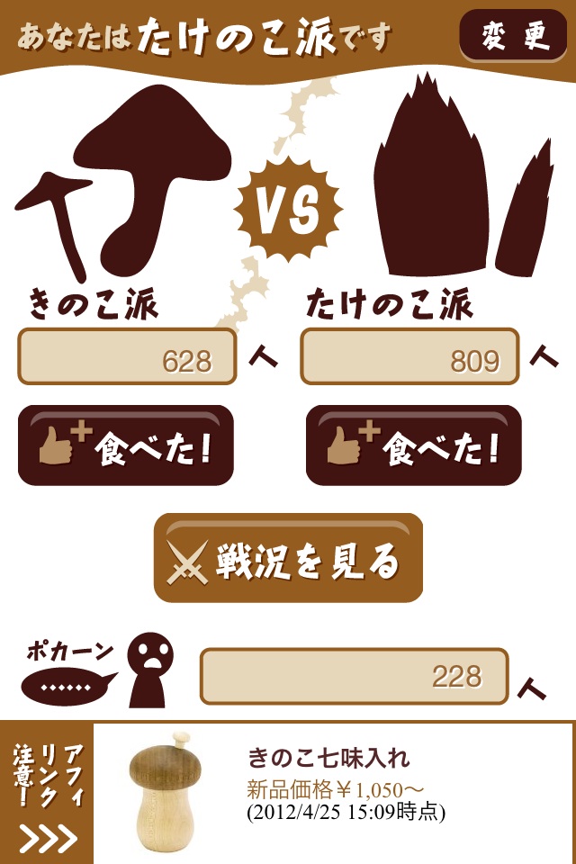 まくまでも、きのことたけのこの争いでアレではありませんよ…と言いながら、つまりあのお菓子のどちらが好きかを競うネタアプリです。